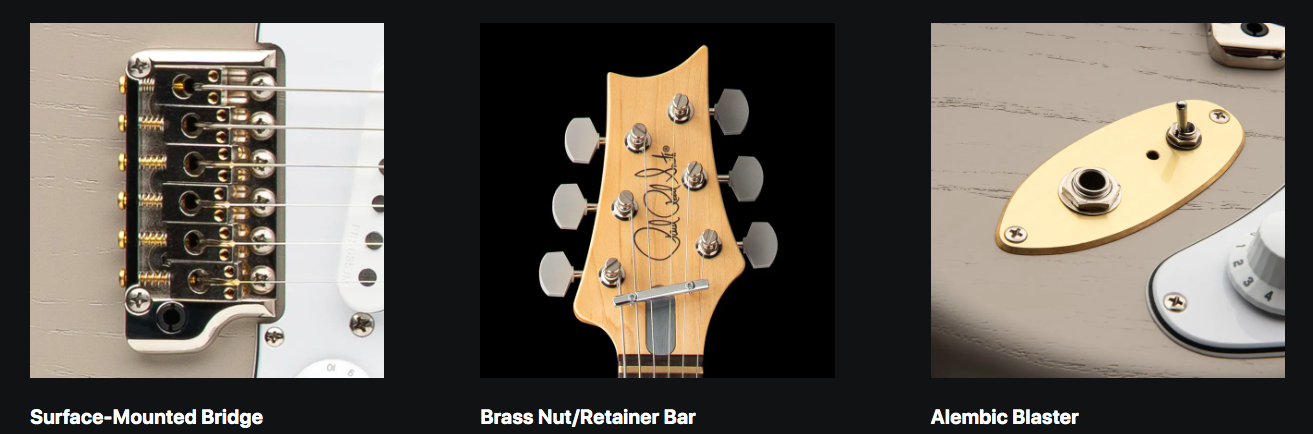 Folks, the guitar in question is the PRS Silver Sky given the Dead Spec mod. The main highlight here is of course that top mounted input jack with that flick switch I initially thought was a pickup selector. A careful re-look showed the SS already had a 5-way so this one is a pre-amp switch (Blaster they call it). Adding to this are the top-mounted fixed bridge which still has a whammy bar hole. Obviously, they avoided re-tooling for this one. Over at the headstock, there's a string retainer bar which is unnecessary if string pressure is the consideration - it was absent in the original iteration. According to PRS, this adds to resonance... like it would make a drastic difference in tone. Not. If you can hear it, then good for you.